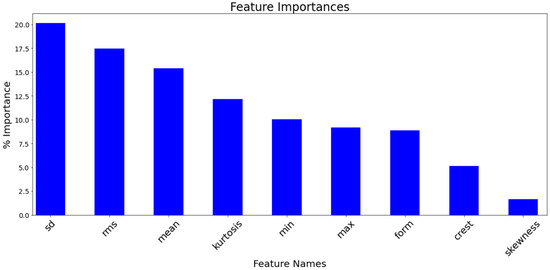 The Figure 4 illustrates the importance of various features in the model. The last three features—form, crest, and skewness—each have an importance of less than 10%, as shown by the lower bars. This low importance is likely to be because these features provide limited additional information beyond what has already been captured by the six key features (e.g., RMS, Standard Deviation, and Kurtosis). For example, standard deviation is indirectly reflected in the calculations of skewness and crest, reducing their independent contribution. By removing these less important features, the model becomes simpler, more computationally efficient, and less prone to overfitting, while maintaining high predictive accuracy.
