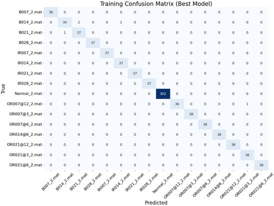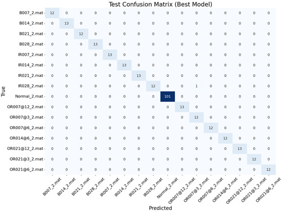 - Misclassifications were observed between the ‘OR007@12_2.mat’ and ‘OR021@3_2.mat’ classes, as well as between ‘OR007@6_2.mat’ and ‘OR014@6_2.mat’ during training. These results indicate that these fault types share similar features, sometimes leading to confusion during training;