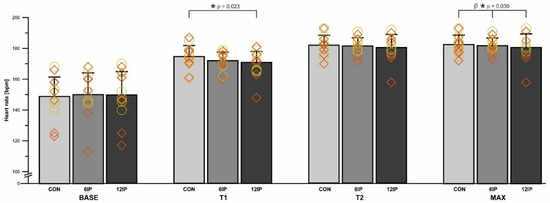p = 0.903), although males had a greater relative increase in the HR in each condition from T1 to T2 (males: 5.3, 6.3, 7.1%; females: 3.4, 4.9, 5.6% for CON, 6IP, 12IP respectively). The overall peak HR (MAX) was significantly decreased (