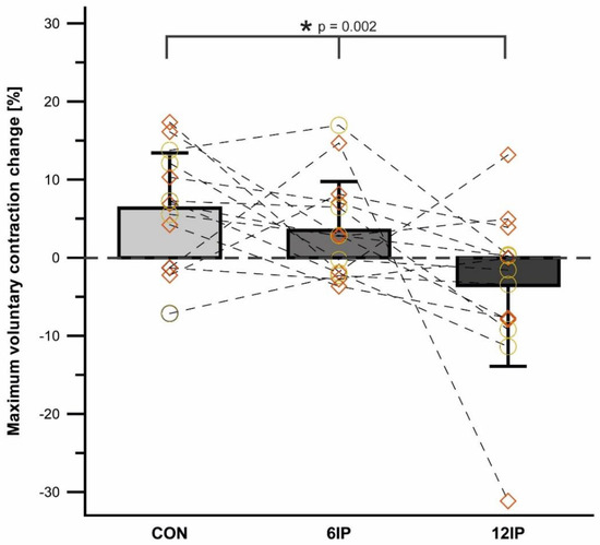 38], which illustrates that cold air may have an effect on performance. Given that there were negligible changes in running performance, it is reasonable to assume that fatigue, measured as the change in MVC from pre- to post-trial in the key locomotor muscles of the leg, would also not be significantly different across conditions. However, there were some noticeable differences in MVC between conditions, where on average, the MVC increased from pre- to post-trial in the CON and 6IP conditions, while it decreased in the 12IP condition. There were 10 participants (5 females) in the CON condition that increased MVC, on average by 38.9 N, whereas in the 12IP, there was an average decrease of 22.7 N for 8 participants (4 females). The reduced MVC in the 12IP condition may be explained by greater cooling affecting the muscle temperature, which can reduce muscle power [