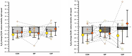 2 in both VM and VL in the first minute in the 12IP condition, compared to 6IP and CON. A likely explanation is that blood flow may have been reduced in 12IP, due to longer exposure to cold air compared to 6IP and CON during the interim period, thereby decreasing muscle oxygenation. Accordingly, reduced muscle blood flow has been reported as one of the main physiological responses to cold-temperature exposure in previous research [