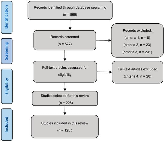 The analytical framework was developed by collecting data according to the Preferred Reporting Items for Systematic Reviews and Meta-Analyses (PRISMA) [38], a technique with a wide range of applications. The methodological framework used allowed for the review of a large number of articles selected according to well-defined parameters. The implementation of this protocol has strengthened the accuracy and reliability of the data obtained from systematic reviews.