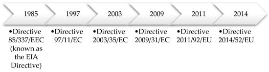 Directive 85/337/EEC, 1985, was the first European legislative framework to formally recognize the environmental impact assessment (EIA) procedure as applicable to both public and private projects, as defined in its annexes. This legislation established the key parameters for the scope and usefulness of the EIA procedure and the mechanisms for public participation in the assessment [3,61,62]. The provisions of Directive 85/337/EEC and its three amendments were consolidated as Directive 2011/92/EU, while Directive 2014/52/EU introduced new amendments on EIA, with entry into force on 15 May 2014. EU Member States transposed these provisions into national law by 16 May 2017 [61]. In support of this directive, the Convention on Environmental Impact Assessment in a Transboundary Context (Espoo Convention, 1991) was drafted, which required the implementation of legislative measures [63,64]. The chronological evolution of these directives is illustrated in Figure 2.