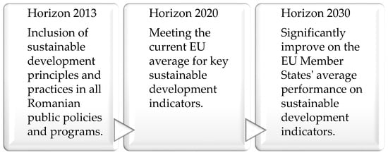 Romania, as well as other 193 countries, has implemented strategies to support the 2030 Agenda for Sustainable Development by addressing a Global Plan of Action that focuses on reducing poverty, reducing social inequality, and protecting the environment by 2030. This plan is a promoter of poverty eradication, climate change, economic growth, and global peace [84]. Basically, the complex web of indicators lies at the center of these paradigms and has become the foundation for the implementation of SDGs. The national sustainable development strategy is illustrated in Figure 3.