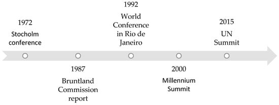 The SD concept has become an important objective for policy-makers [57]: “Sustainable development must be understood as a type of economic development that ensures meeting the needs of present generations without compromising the ability of future generations to meet their own requirements and applicable measures aimed at long intervals and long-term effects” [92]. Comparing the SD definition with the EIA principles, it may be noted that both are concerned with the well-being of present and future generations. One of the objectives of this concept is to find an optimal point between the interaction of four systems: social, economic, technological, and environmental. In this context, the most important international conferences, at which a number of issues related to sustainable development have been discussed, are depicted in Figure 5.