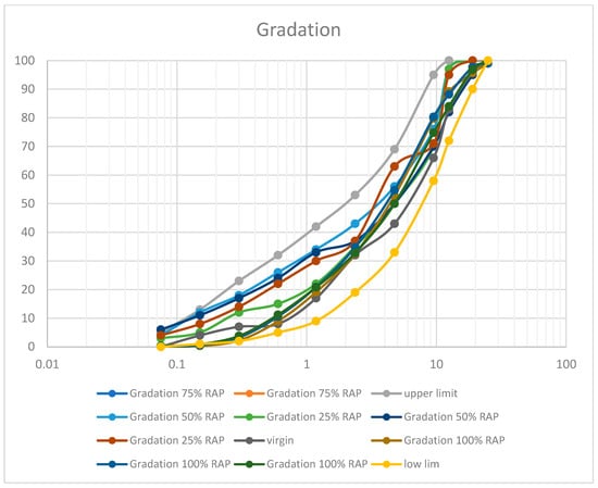The characteristics of RAP aggregates varied across different sources. For instance, RAP-1 had a maximum aggregate grain size of 19 mm, RAP-2 had 12.5 mm, and RAP-3 had 9.5 mm, consisting of finer fractions. To ensure compliance with standards, the gradation curves for different RAP contents were analyzed in accordance with EN 933-1 [11], and EN 13043 [12].