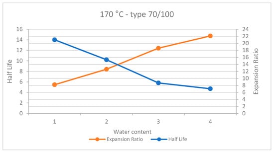 For the foaming process according to Wirtgen WLB 10S Guidelines, bitumen 70/100 demonstrated a half-life of 10.2 s and an expansion ratio of 12.6 times when mixed with 2% water at a temperature of 170 °C. Meanwhile, bitumen 50/70 exhibited a half-life of 12.3 s and an expansion ratio of 11.4 times with a 2.5% water content at the same temperature, as shown in Figure 2 and Figure 3. Notably, according to these guidelines, the foam should have a minimum expansion ratio of eight times the original volume and a half-life of 6 s to ensure effective aggregate stabilization at temperatures exceeding 15 °C.