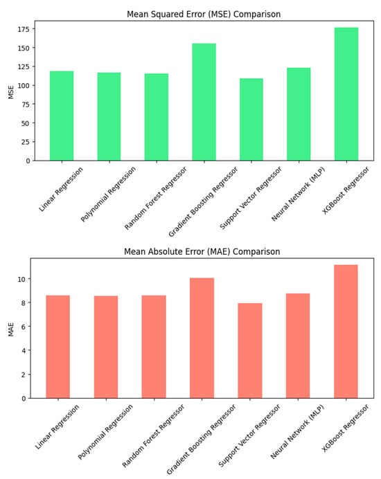 Figure 4 compares the performance of various AI models that use real experimental test results as inputs. The errors shown represent the performance of each model, helping to determine the most accurate one that can best fit this dataset, considering the complex relationship between foamed bitumen parameters. This selection process allows for deeper training on the dataset, which includes experimental tests with varying RAP content (0–100%) and foamed bitumen content (1.5–4%). After training the model, boundary limits were set for RAP and FBC to refine the predictions. The goal is to identify the best-performing model for further refinement and practical application. All models achieved a high R2 above 0.83 with a small mean squared error (MSE) and a mean absolute error (MAE). Based on the metrics, the Random Forest Regressor is the best-performing model. However, in this comparison, it showed a performance similar to that of SVR, but RF performs well with large, high-dimensional datasets and can effectively handle non-linearity, noise, and missing data. Unlike SVR, it is less sensitive to feature scaling.