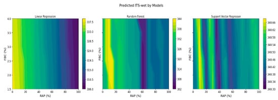 In the analysis of ITS-wet predictions, yellow represents higher predicted ITS values, indicating better tensile strength, while dark blue represents lower predicted ITS values, indicating weaker tensile strength. The optimal configuration for Linear Regression was identified with an FBC ranging from 2.00% to 2.30% and a RAP between 0% and 6%, leading to a predicted ITS of 338.18 MPa. Conversely, Random Forest demonstrated slightly superior performance with an FBC of 1.50% to 1.7% and a RAP of 62% to 68%, resulting in a predicted ITS of 341.67 MPa. Support Vector Regression (SVR) pinpointed its best combination as an FBC of 1.5% to 1.80% and a RAP of 64% to 70%, yielding a predicted ITS of 340.68 MPa, as shown in Figure 5.