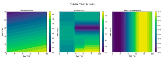 For ITS-dry predictions, the most effective combination for Linear Regression was an FBC of 1.5% to 1.70% with a RAP exceeding 90%, which predicted an ITS of 444.55 MPa. In contrast, Random Forest identified an FBC of 1.50% and a RAP of 64% to 68%, achieving a slightly elevated predicted ITS of 455.46 MPa. SVR also found an optimal combination with an FBC of 1.5% to 1.80% and a RAP of 76% to 80%, resulting in a predicted ITS of 429.80 MPa (Figure 6).