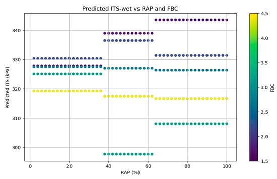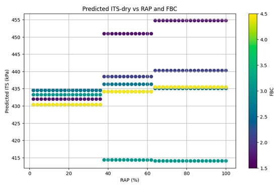 Across both wet and dry conditions, the percentages of FBC and RAP are crucial in determining the mechanical properties of the asphalt mixture. Generally, an increase in RAP tends to reduce the ITS due to the aging and inferior quality of the binder in RAP materials; however, the interplay with FBC alters this dynamic. FBC serves as a binder that enhances the stiffness and performance of the mixture by strengthening the bond between aggregates, especially under dry conditions. The models, especially Random Forest, adeptly capture the intricate nature of these interactions, as Figure 7 and Figure 8 show. The high percentage of RAP with a small one of FBC achieved high ITS results.