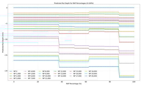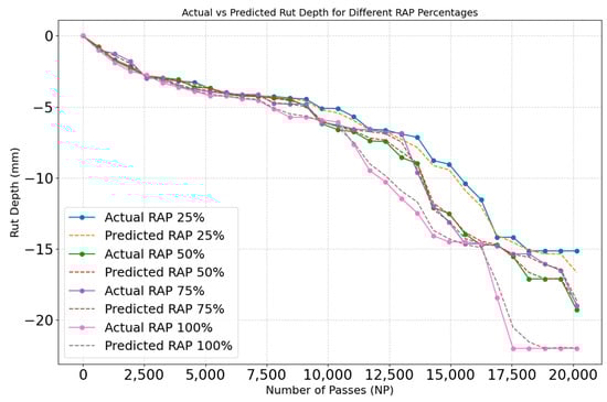 The second stage of prediction, as Figure 11 presents, involved forecasting rut depth after training the model with a 2% increase in RAP and a total of 1000 passes. The results indicated that using 0% to 40% RAP is generally acceptable, as it slightly enhances resistance. In contrast of it, RAP of between 60% and 80% demonstrated a significant improvement in rut depth up under 13,000 passes, after which rut depth increased as the RAP content exceeded 80%. Notably, resistance improved with the use of up to 100% RAP until reaching 11,000 passes, compared to actual rut depth results. This suggests that higher RAP content can enhance rutting resistance under specific conditions, although attention should be given to the 80% to 90% range, which resulted in reduced resistance to cracking.