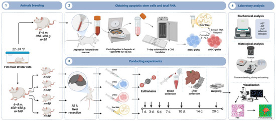 Younger rats (n = 30) served to obtain HSCs. Older rats (n = 160) experienced extended (75%) liver resection (ELR) according to common approaches [30,31]. Due to inability to accomplish all the experiments and surgeries on the same days, we performed eight consecutive rounds with 5 animals per group, considering the pilot experiment also, and then rejoined the numerical data for statistical processing.