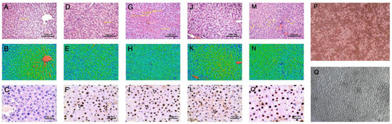 Histological slides of liver from rats before ELR and 48 h after. (A,B)—intact liver at Day 0; (D,E)—control group; (G,H)—group of iHSC; (J,K)—group of aHSC; (M,N)—group of total RNA. The second row shows pseudostaining of the corresponding images from the first row (hepatocyte nuclei are blue, cytoplasm is green, empty spaces are red). Yellow arrows indicate mitotic hepatocytes. H&E staining, ×200. Scale bar 100 μm. Caspase-9 expression on histological slides of liver from rats 48 h after ELR. (C)—intact liver at Day 0; (F)—control group; (I)—group of iHSC; (L)—group of aHSC; (O)—group of total RNA. Arrows indicate cells during mitosis. Although many of them are caspase-9-positive (i.e., in reversible apoptosis), the proliferation is evident. Anti-caspase-9 immunohistochemical staining with additional Mayer’s hematoxylin staining, ×200. Scale bar 100 μm. Cell cultures. (P)—culture of cells from the bone marrow of rats, 7 days of cultivation, ×100; (Q)—non-attached HSCs washed from the surface of cultivated cells, ×200, phase contrast.