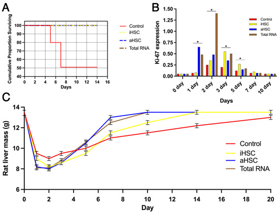 Dynamics of animal survival, Ki-67 expression, and rat liver mass. (A)—survival at percents after 75% ELR in rats (Kaplan–Meier). Groups of iHSC, aHSC, and total RNA increased the survival rate after ELR (p = 0.037, log-rank test); (B)—timepoints at dynamic logarithmic function of Ki-67 expression; *—the difference is significant compared with the control group; p < 0.05; (C)—recovery of rat liver mass in grams after ELR. Values are given as means ± SDs.