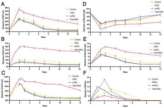 The high mortality after surgery in the control group is consistent with acute liver failure confirmed by an increase on Day 2 compared to Day 0 in AST (572 ± 42.2 u/L to 71 ± 14.8 u/L), ALT (315 ± 3.7 u/L to 35 ± 2.3 u/L), ALP (1102 ± 37.2 u/L to 382 ± 29.8 u/L), and total bilirubin (2 ± 1.8 g/L to 10 ± 2.1 g/L with the increase continuing up to Day 12) levels (markers of cell lysis) in the blood of the rats (Figure 4A–E). The iHSC, aHSC, and total RNA groups exhibited a higher rate of biochemical recovery than the control group, as shown by repeated t test comparisons with p ˂ 0.05. In the iHSC, aHSC, and total RNA groups, cell lysis markers also increased to a lesser extent during the first two days but recovered completely by Day 12–14. Thus, the AST levels on Day 2 were the least for the total RNA group (330 ± 29.7 u/L), ALT levels were the least for the total RNA group (81 ± 6.4 g/L), ALP levels were the least for the aHSCs group (892 ± 32.4 u/L), and total bilirubin was the least for the total RNA (6 ± 1.2 g/L) group.