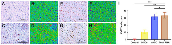 Ki-67 expression at histological slides of liver from rats by 48 h after extended liver resection. (A)—Control group, Ki-67-negative; (C)—Group of iHSC with Ki-67-positive hepatocytes, widened sinusoids; (E)—Group of aHSC with a large number of Ki-67-positive hepatocytes; (G)—Group of total RNA with a large number of Ki-67-positive hepatocytes. Images (B,D,F,H) show pseudostaining of (A,C,E,G), respectively. Hepatocyte nuclei are blue, cytoplasm is green, empty spaces are red. Anti-Ki-67 immunohistochemical staining with additional Mayer’s hematoxylin staining, ×400. Scale bar 20 μm. (I)—the number of Ki67+ cells per field of view at the slides of the liver on Day 2. *—the difference is significant compared with the control group; p < 0.05; **—p < 0.01, ***—p < 0.001.