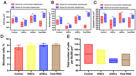 Morphometrics for mono- and binuclear hepatocytes by 48 h after extended liver resection. Median values are provided with 25th and 75th percentiles: (A)—cell area, μm2; (B)—nucleus area, μm2; (C)—cytoplasm area, μm2; (D)—relative number of binuclear cells, %; (E)—total number of hepatocytes per 50,000 μm2. *—the difference is significant compared with the control group; p < 0.05.