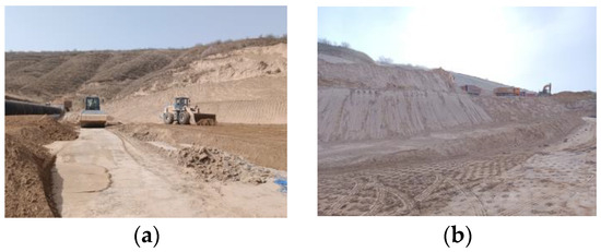 The project area is located in the loess plateau, a region characterized by a complex landform with numerous gullies; here, the average annual rainfall is 300–500 mm, the average annual temperature is 5 °C, and the average winter temperature is −6.9 °C. Under the influence of flowing water, the loess is typically eroded, forming features such as loess beams and loess hills. The area between Liang and Mao is primarily composed of narrow, deeply cut loess gullies, with bedrock often exposed. In addition to these narrow gullies, erosive valley landforms are also present, which are relatively flat and wide; field compaction of the subgrade and the landform characteristics are shown in Figure 2. The site consists of self-weight collapsible loess with a medium collapsibility degree [26]. The standard depth of the frozen soil is 820 mm (average depth), and the compaction degree of the foundation is 90%, while the lower subgrade has a compaction degree of 93%, and the upper subgrade has a compaction degree of 95%.