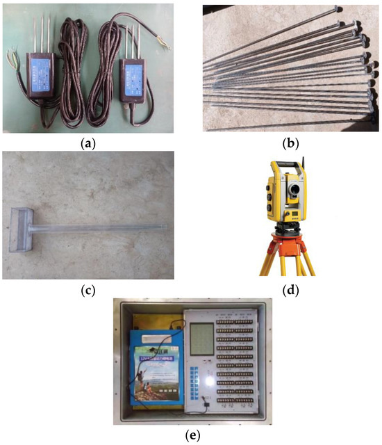Test equipment. (a) Moisture sensor; (b) settlement measuring rod; (c) seepage pipe; (d) total station; (e) acquisition instrument.