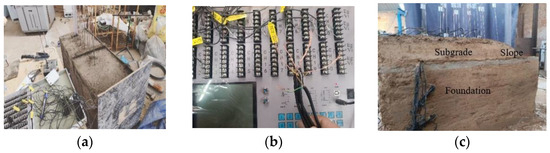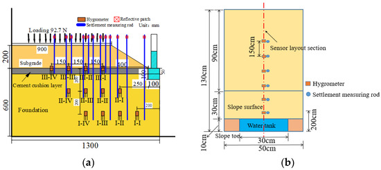 Soil samples from the site were collected, transported, and dispersed before being air-dried to prepare the models, following compaction standards that varied according to the positions of the subgrade and foundation. Due to limitations in the available test soil and site conditions, the road was treated symmetrically along the centerline. Additionally, considering the infinite extension of the foundation and a similarity ratio of 20, the foundation had a height of 0.6 m, a width of 0.5 m, and a length of 1.3 m. Considering that the infiltration from the side ditch primarily humidified the lower subgrade, the height of the far subgrade was controlled at 4 m. After this control, the model subgrade had a height of 0.2 m, with a length of 1.2 m and a width of 0.5 m. A 0.1 m slope foot was reserved, and the subgrade side slope was approximately 1:1.5. The model diagram is shown in Figure 6.