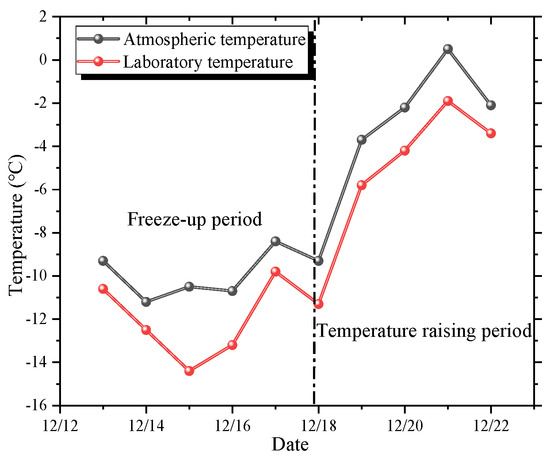 The moisture field and settlement deformation characteristics of the foundation and lower subgrade in the loess subgrade of seasonal freezing areas, influenced by water infiltration from the slope foot ditch under atmospheric precipitation, were studied by regularly injecting water into the model’s side ditch. Figure 9 illustrates the changes in atmospheric and indoor temperatures.