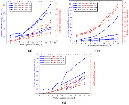 Figure 10 illustrates the relationship between moisture content, settlement, and the amount of water injected at different monitoring locations of the model.
