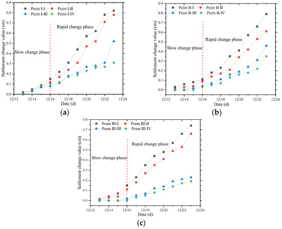 By comparing Figure 11a–c, it is evident that the settlement at points I and II of each layer is most pronounced, with settlement exceeding 0.5 cm by the end of the test. In contrast, the settlement deformation at points III and IV, located at the interface between the subgrade and foundation, is minimal. This is attributed to the distance of the monitoring area from the water injection point, which limits the spread of water flow. The results indicate that the wetting and softening damage caused by infiltration from the side ditch of the fill subgrade primarily affects the foundation. Overall, the model exhibits a “bending dump” failure due to water seepage.