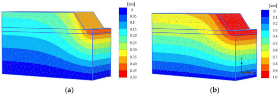 Finite element simulations reveal that settlement primarily occurs in the middle and late stages of water seepage, with an inverted “S” contour distribution. Settlement deformation is more pronounced the closer the location is to the side ditch. This is due to the significant increase in soil moisture content in this area as a result of water seepage, causing the soil mass to collapse under its own weight. During the middle stage of seepage, settlement deformation is relatively small, with the maximum value reaching 0.50 cm near the foot of the slope. By the end of seepage, most of the model’s settlement exceeds 0.40 cm, with the maximum value reaching 1.0 cm, primarily at the side slope and slope foot. A comparison of Figure 13a,b shows that the settlement is predominantly concentrated at the slope foot and in the slope area. This is due to the generation of high pore water pressure and dynamic water pressure at the slope foot, which, combined with water seepage, causes the soil to gradually transition to a wet and soft state. As a result, the slope progressively collapses under its own gravity. The results indicate that water infiltration at the foot of the slope causes significant damage to the foundation and subgrade, leading to considerable settlement deformation. In practical engineering, strengthening slope support and drainage at the foot of the slope is essential.