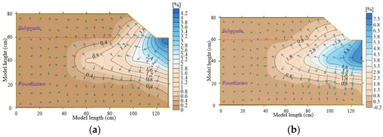 As can be seen from Figure 14a, at the initial stage of seepage, the water flow mainly diffuses horizontally. If a change of 1% in the moisture content is the effective influence area, the influence area is mainly in the circular arc area with the slope foot as the center, where the radius is 40 cm, and the maximum change value reaches 4.2%. As can be seen from Figure 14b, with continuous water injection, the direction of water flow gradually diffuses to all sides, and the influence range approximately presents an arc area with the slope foot as the center of the circle and a radius of 60 cm, with the maximum change value reaching 7.3%. At the end of the test, the bulk moisture content of most regions of the foundation fluctuates, and the bulk moisture content of some of the subgrade fluctuates slightly, which indicates that the water in the ditch at the foot of slope in actual engineering mainly affects the wetting of the foundation and the interface between the subgrade and the foundation and then induces the collapse of the subgrade slope.