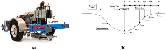 The FWD is a specialized device used to assess pavement deflection similar to that caused by a fast-moving truck. It operates by dropping a weight that transmits a load pulse through a 300 mm diameter circular load plate, momentarily deforming the pavement into a dish-like shape known as a deflection basin [8]. The system consists of a deflectometer, a system processor, and a computer for data collection and analysis, as shown in Figure 2. This deformation allows for the estimation of pavement stiffness through computational methods, considering the thickness and stiffness of individual pavement layers. The FWD is equipped with primary measurement devices including a load cell, which measures the force applied to the pavement, and deflection sensors, typically geophones, that record the shape of the deflection basin. The Long-Term Pavement Performance (LTPP) Program’s FWDs utilize nine deflection sensors positioned at fixed distances from the load plate [8]. Researchers have always tried to utilize the valuable insight that FWD data provide about the structural integrity of the pavement [9,10]. The primary objective of collecting and analyzing FWD data lies in its application toward assessing the “pavement performance” of existing roadways. These data enable the study of pavement performance indicators, such as asphalt concrete (AC) fatigue and rutting, under expected traffic loads. This is achieved by conducting a layered elastic analysis, which utilizes the layer moduli derived from the FWD measurements as critical inputs [11]. Gedafa et al. used the center deflection value from FDW data to predict the Remaining Service Life (RSL) of the pavement [12]. Through a comprehensive examination of the FWD data, a research initiative undertaken by [13], sought to develop a robust methodology for evaluating the structural integrity of road pavements, designed with the purpose of facilitating seamless incorporation into databases overseen by transportation agencies. Saleh et al. [14] introduced the area ratio and the normalized area ratio as better indicators of the structural capacity of asphalt concrete than deflection parameters. The Structural Adequacy Index, abbreviated as SAI, was an original measure conceived by Haas et al. [15], which emerged from a unique deflection reading gathered via the Benkelman beam evaluation. Considering that this metric is predicated on a single deflection value, even minor discrepancies in measurement could adversely affect its validity. The back-calculation method of utilizing FWD data requires layer thickness information, which might not be readily available, so, deflection basin parameters from the FWD data were utilized to infer the structural condition of the pavement [16].