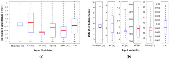 Box plot of (a) normalized input variables (−1 to 1), (b) data distribution range without normalization.