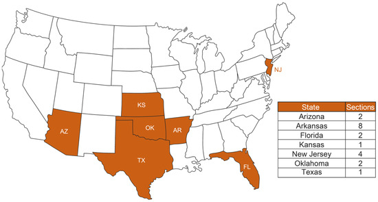 The selection of these inputs was informed by an extensive review of the literature focusing on fatigue cracking in asphalt pavements. A total of 311 datapoints were collected from the LTPP database, representing a wide range of climatic zones. The dataset includes data from seven U.S. states—Texas, Arizona, New Jersey, Kansas, Oklahoma, Florida, and Arkansas—highlighting diverse climatic zones essential for asphalt pavement analysis. These states encompass all four primary climatic zones pertinent to pavement performance: Wet Freeze, Wet No-Freeze, Dry Freeze, and Dry No-Freeze. For example, New Jersey and parts of Kansas are categorized under the Wet Freeze zone due to their cold winters and substantial precipitation. Texas and Florida, characterized by high humidity and rainfall without freezing temperatures, exemplify the Wet No-Freeze zone. The Dry Freeze zone is represented by certain areas in Kansas, while Arizona primarily illustrates the Dry No-Freeze zone due to its arid climate. This varied selection of states guarantees that the dataset reflects the diverse climatic conditions throughout the U.S., providing a robust basis for examining the influence of different climates on asphalt pavement performance. This dataset includes information from 19 LTPP sections across 7 states in the United States. The geographic distribution of the LTPP sections analyzed in this study is depicted in Figure 4, providing a visual overview of the areas covered in this analysis. This broad sampling helps ensure that the findings are applicable across diverse environmental conditions and traffic patterns.