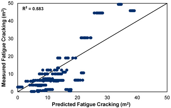 Furthermore, while this study identified asphalt content as the most influential factor in fatigue cracking predictions consistent with prior research, some studies highlight the impact of moisture susceptibility, binder aging, and traffic loading as equally or more significant under certain conditions [4,36]. Opposing viewpoints argue that environmental factors, such as freeze–thaw cycles and drainage efficiency, can play a dominant role in long-term pavement durability. This underscores the need for further investigations to identify additional key variables that influence fatigue cracking across different pavement structures and climatic zones. Future models should integrate these additional influential parameters to enhance predictive accuracy. The sensitivity analysis of the AC thickness showed very minimal influence in the fatigue crack area in contrast with the available literature, this may be remedied in future studies by including more diverse datasets.