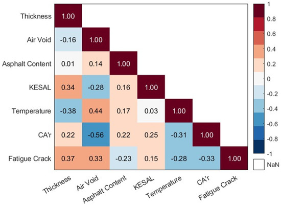The Pearson correlation heatmap (Figure 6) shows the relationships between pavement parameters and fatigue cracking. Fatigue crack correlates positively with thickness (0.37) and air void (0.33), while CA’r (−0.33) and temperature (−0.28) show negative correlations. The strongest negative correlation is between CA’r and air void (−0.56). These insights highlight key factors influencing fatigue cracking, aiding in pavement design optimization.