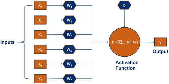 The input layer processes normalized raw data within the range of [−1, 1] to enhance training stability and convergence. Normalization facilitates the equitable treatment of inputs, mitigating the impact of magnitude discrepancies on model efficacy [31]. Each input variable is linked to hidden layer neurons via weighted connections and biases. These weights and biases constitute parameters acquired by the network throughout the training phase. The outputs from the hidden layer are transmitted to the output layer for further processing with weights and biases. The final output is derived from these weighted inputs. The output layer may employ distinct activation functions based on the task, including linear activation for regression and sigmoid or softmax for classification. The framework of an ANN model is shown in Figure 7.