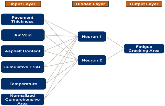 The model’s design features an architecture with six different inputs feeding into the input layer, followed by a hidden layer that contains two neurons and culminates with an output variable tasked with predicting the area affected by fatigue cracking. In the Long-Term Pavement Performance (LTPP) database, fatigue cracking is classified into three categories, reflecting varying levels of distress [28]. The total area of cracking is computed by summing the areas corresponding to all three levels of distress.