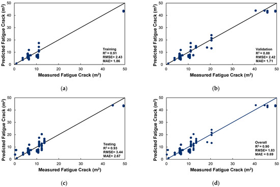 The performance of the developed neural network model for fatigue crack area prediction was evaluated using training, validation, and testing datasets, as illustrated in Figure 9. The scatter plots compare the predicted fatigue crack area (m2) with the measured fatigue crack area (m2), assessing the model’s predictive accuracy.