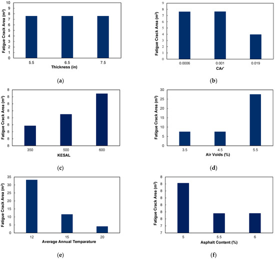 Sensitivity analysis, (a) fatigue crack vs. thickness, (b) fatigue crack vs. CA’r, (c) fatigue crack vs. KESAL, (d) fatigue crack vs. air void, (e) fatigue crack vs. annual temperature, (f) fatigue crack vs. asphalt content.