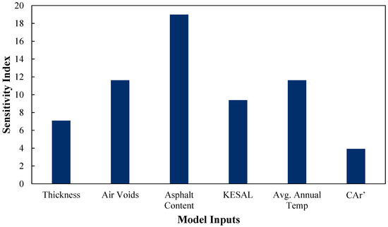 In Figure 11, the SI chart illustrates the degree to which each factor influences the model’s output. Notably, asphalt content is the most impactful parameter with the highest sensitivity index of close to 8, indicating significant changes in the model’s output in response to even minor variations in asphalt content. On the other hand, CAr’ shows minimal impact, with an index around 2, suggesting it has the least influence on the model. Other parameters like Thickness, Air Voids, KESAL, and average annual temperature also vary in their sensitivity, with indices ranging from about 3 to 5. This visualization aids in identifying which factors are crucial for the model’s performance, guiding targeted adjustments and prioritization in the modeling process.