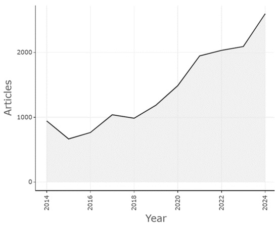 The returned result contains 15,718 documents. Among these, there could be some out-of-scope publications; however, the presumption is that mentioning the words “intelligent AND education” in the title, abstract, and author keywords provides a solid basis to show the research topics in the area. The extracted bibliometric information of these publications is ordered by relevance and analyzed using RStudio 2024.12.1 and the bibliometrix:biblioshiny application. The annual growth rate is 10.68%, noticing a trend of a continuously increasing number of publications, as in 2014, there were 941; in 2020, there were 1486 (about 1.58 times more than in 2014); and in 2024, there were 2596 (about 2.76 times more than in 2014) (Figure 1). This can be explained by the development of intelligent technologies and their impact on education. Researchers observe how these technologies can contribute to enhancing learning and teaching and improve the quality of education in general.