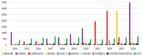 A detailed contribution analysis of the top 10 countries shows that the greatest number of publications come from authors mainly from three countries: China, Germany, and the United States (Figure 2).