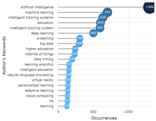 Regarding scientific content, the twenty most frequently used keywords by authors to describe the articles’ research focus for 2014–2024 are shown in Figure 3. Both technologies (e.g., artificial intelligence, machine and deep learning, natural language processing, data mining, learning analytics, intelligent tutoring systems, and virtual and augmented reality) and educational context (e.g., personalized learning, adaptive learning, higher education, and e-learning) are described.