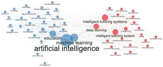 The co-occurrence network shows two clusters with similar terms (Figure 4). The first cluster is formed around the keywords artificial intelligence, machine learning, and education (in blue), which has the biggest co-occurrence in comparison to other terms in the same cluster. The main keywords in the second cluster are intelligent tutoring systems and deep learning (in red).