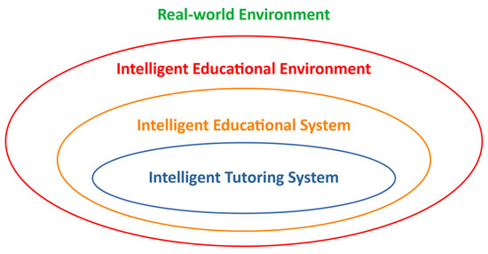 The authors consider the intelligent educational environment as an overarching concept that integrates aspects of both an intelligent educational system and an intelligent tutoring system. The nested view of the relationships among these systems is illustrated in Figure 5. As the earliest concept, intelligent tutoring systems can lie at the core of any intelligent educational system, providing means for personalized teaching and learning. The IES is intended to deliver educational services on a new qualitative level, thus facilitating the pedagogical process and managing the complex relationships between implemented technologies and IES users. In turn, it is part of an intelligent educational environment that connects it to the real world by sensing and controlling various environmental parameters. Each outer-level concept inherits the attributes and functionalities of the inner-level ones. The IEE is the broadest concept that reflects the interaction of the IES with the real world and supports the teaching–learning process.