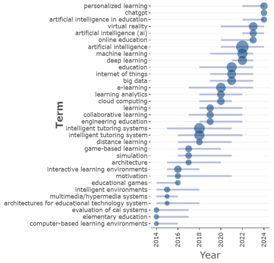 As seen in Figure 6, artificial intelligence has been among the leading three keywords since 2021. This shows a stable interest in implementing AI in the educational framework. The presence of terms such as machine learning, deep learning, learning analytics, big data, cloud computing, and ChatGPT indicates the integration of intelligent technologies into contemporary education. This is also supported by the researchers’ keywords, such as online education, e-learning, and distance learning. The leading place of the term personalized learning for 2024 could be due to the synergy of these two groups of terms.