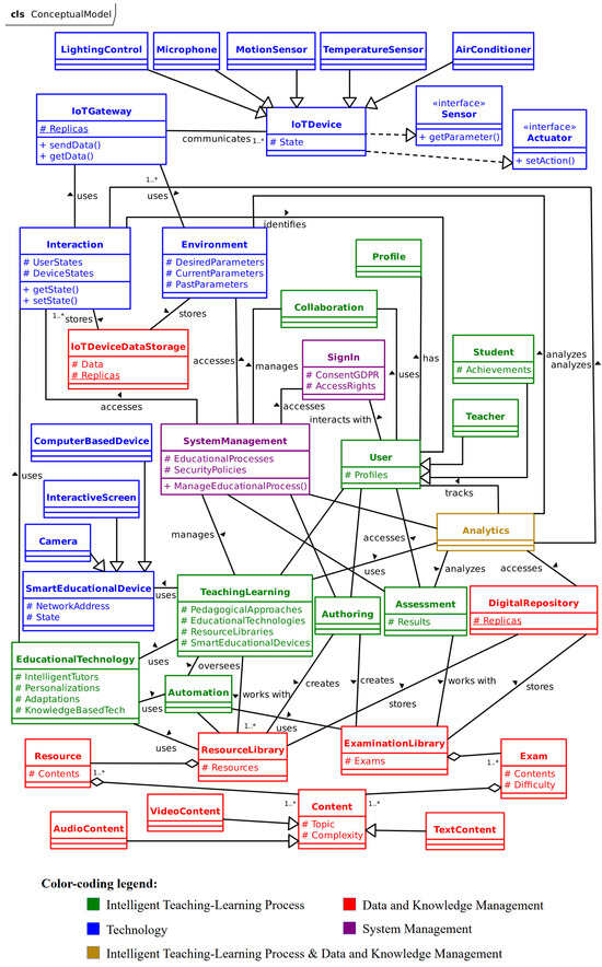 Technology embraces both educational and environmental devices. From an educational perspective, here are all ICT devices and tools, such as networked computers and tablets, smart boards and screens, projection systems, video and audio devices, 3D printers, etc. To consider aspects of an educational environment and students’ behavior, smart devices that ensure appropriate and comfortable conditions for providing an intelligent educational process are included. Furthermore, these devices can support innovative teaching tasks by supplying environmental and behavioral data. The UML model represents these capabilities by introducing the blue-colored classes SmartEducationalDevice (and its subclasses), IoTDevice (and its subclasses), IoTGateway, Environment, and Interaction as well as the blue-colored interfaces Sensor and Actuator.