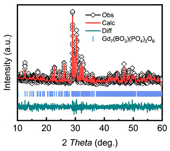 A high-quality polycrystalline sample of the Gd7(BO3)(PO4)2O6 compound was synthesized using a high-temperature solid-state reaction method. The starting materials used for the synthesis were NH4H2PO4 (99.99%), Gd2O3 (99.99%), and H3BO3 (99.99%). Prior to the mixing process, all raw materials should be subjected to drying in an oven for 24 h to eliminate any adsorbed moisture. Additionally, weighing should be conducted in an inert nitrogen environment to avoid hydration. These reagents were mixed in stoichiometric proportions and thoroughly ground in an agate mortar. To compensate for the volatilization of NH4H2PO4 and H3BO3 at high temperatures, an excess of these precursors was added. After sufficient grinding, the mixture was initially heated at 773 K for 5 h. Subsequently, the sample was heated at 1473 K for 10 h, then removed from the furnace and reground. The grinding and heating process at 1473 K was repeated until a pure phase was obtained. All heating processes involve placing the sample in an alumina crucible and are carried out in air. The crystal structure of the synthesized compound was analyzed at room temperature by powder X-ray diffraction (XRD) using a diffractometer with Cu Kα radiation (λ = 1.5406 Å). The XRD data were collected over a 2θ range of 10° to 60° with a step size of 0.02° and a scanning speed of 2° per minute. To investigate the magnetic properties of the compound, temperature-dependent magnetization measurements were performed using a Quantum Design Physical Properties Measurement System (PPMS-9) equipped with a vibrating sample magnetometer (VSM) option. The measurements were carried out in the temperature range of 2–300 K under an applied magnetic field of 0.05 T. Field-dependent magnetization measurements were also conducted at various temperatures using the VSM option of the PPMS-9, with applied magnetic fields up to 7 T.