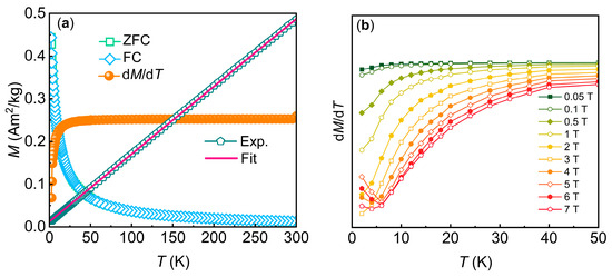 (a) The magnetic susceptibility versus temperature curve under a 0.01 T magnetic field. The inset shows the dM/dT curve to determine the magnetic transition temperature. The green and pink lines represent the experimental and fitted values, respectively, obtained from the Curie–Weiss fitting. (b) The dM/dT curves of Gd7(BO3)(PO4)2O6 compound under different magnetic fields, where the magnetization M is obtained from isothermal magnetization curves at different temperatures.
