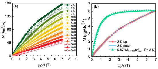 In recent years, considerable efforts have been devoted to exploring novel magnetocaloric materials with enhanced performance in the ultra-low-temperature regime [5,6]. Among the various material families, rare-earth-based compounds have emerged as promising candidates, owing to their large magnetic moments and diverse magnetic interactions [7,8,9,10]. Gadolinium-based compounds have attracted significant interest due to the high magnetic moment of Gd3+ ions (7.94 ) and their potential for achieving large MCE [11,12,13,14,15]. Chen et al. reported on the GdF3 compound, which features high spin, high-density structure, and weak ferromagnetic interactions [16]. This compound exhibits a maximum magnetic entropy change of up to 528 mJ·cm−3 K−1 under a varying magnetic field of 0–9 T. Zhang et al. investigated the magnetism and magnetocaloric effect of the Gd2CuTiO6 compound with a double perovskite structure [17]. Due to the exchange interactions between the Gd-4f and Cu-3d magnetic sublattices, this compound demonstrates enhanced low-temperature magnetocaloric effects, achieving a maximum magnetic entropy change of 51.4 J kg−1 K−1 under a magnetic field change of 0–7 T. Chen et al. studied the magnetic properties and magnetocaloric effect of NaGd9(SiO4)6O2 single crystals [18]. The high magnetic density and relatively weak exchange interactions in this compound lead to a magnetic ordering transition at 2.6 K, with a volumetric magnetic entropy change of 382.8 mJ·cm−3 K−1 under a magnetic field of 0–7 T. Therefore, gadolinium-based compounds with a high magnetic density are promising candidates for further exploration in the quest for high-performance cryogenic magnetic refrigerants.